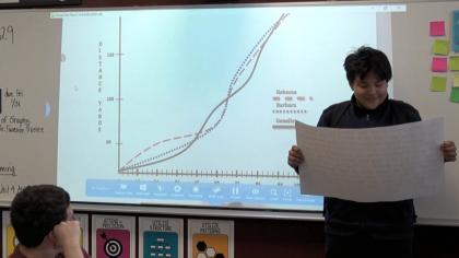 In this lesson, Lisa challenges students to interpret data from a swim meet and to create commentary to reflect the changing data over the time of the race. She engages students in creating connections to the scenario, provides opportunities for them to watch an exemplar swim meet video from the Olympics in which the lead changes multiple times, and then prompts them to use the data given to create an engaging, dynamic, thrilling, and mathematically precise radio commentary recounting the swim race.